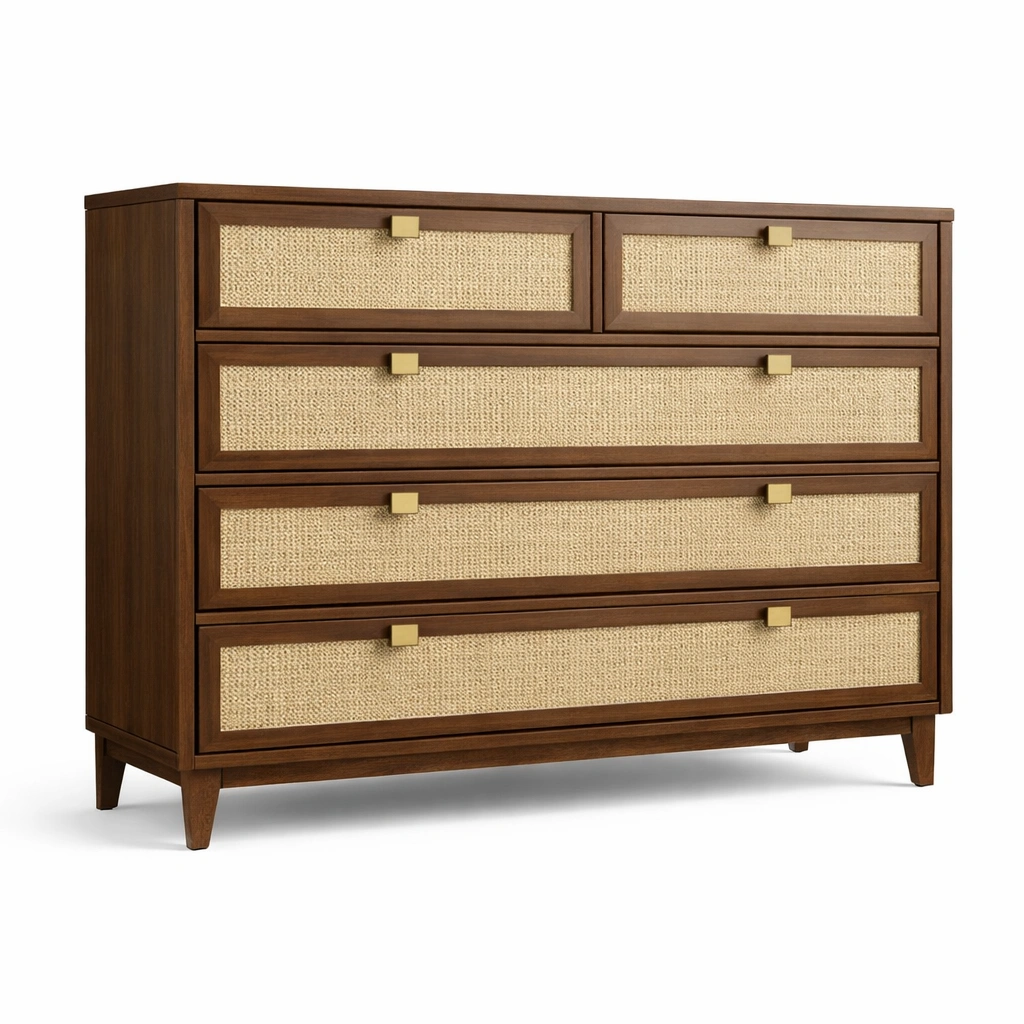 Commode à tiroirs en bois et rotin avec poignées métalliques