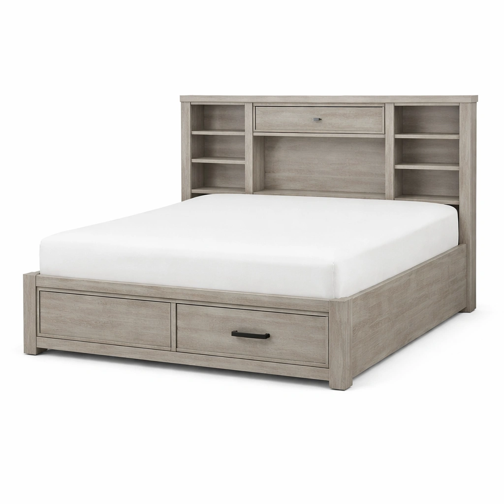 Fonction de rangement : Tête de lit avec étagères et tiroir, base avec tiroirs de rangement